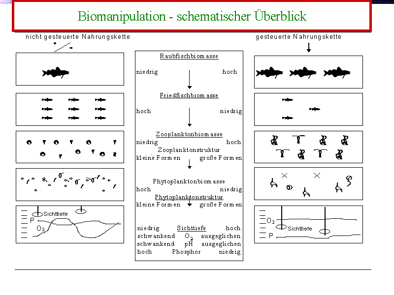 The concept of manipulating the food chain (biomanipulation) is based on the control or encouragement of this large zooplankton by intervening in the final link of the food chain in the lake, the fish. The desired effect continues like a cascade through the whole food chain (Figure).